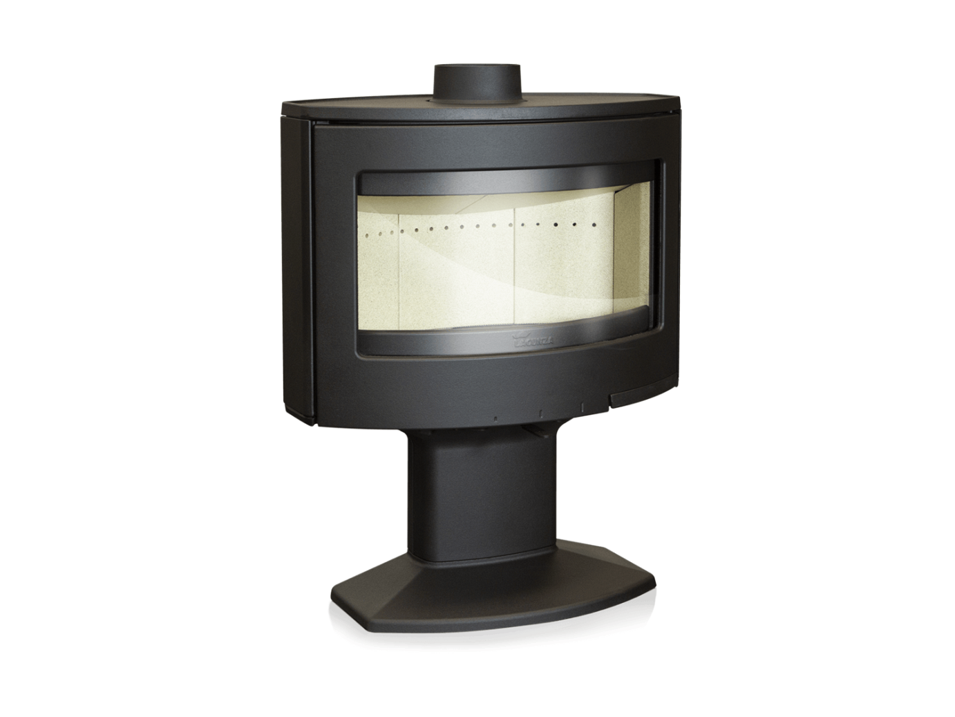 Poêle en fonte et acier aux formes arrondies et verre sur trois côtés qui permet de profiter d'une vue en hauteur sur le feu.